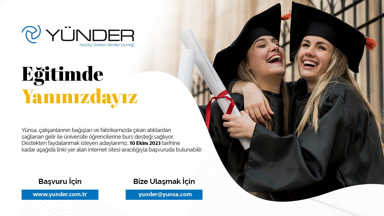 2023-2024 eğitim-öğretim döneminde başarılı ve maddi desteğe ihtiyacı olan Lisans düzeyinde öğrenim gören öğrencilere Yenilikçi Üretken Nesiller Derneği (YÜNDER) tarafından burs verileceği bildirilmiştir.