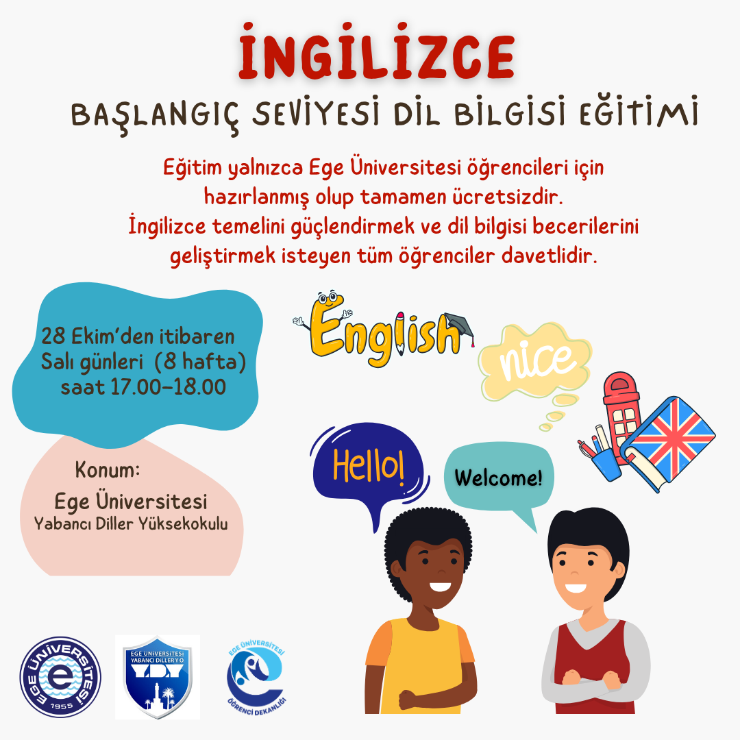 Öğrenci Koordinatörlüğü ve Yabancı Diller Yüksekokulu işbirliği ile Üniversitemizde öğrenim gören tüm öğrencilerimize 28 Ekim 2025 tarihinden itibaren Salı günleri (8 hafta) 17.00-18.00 saatleri arasında Yabancı Diller Yüksekokulu'nda "İngilizce Başlangıç Seviyesi Dilbilgisi Eğitimi" açılacak olup kontenjan sınırlıdır.